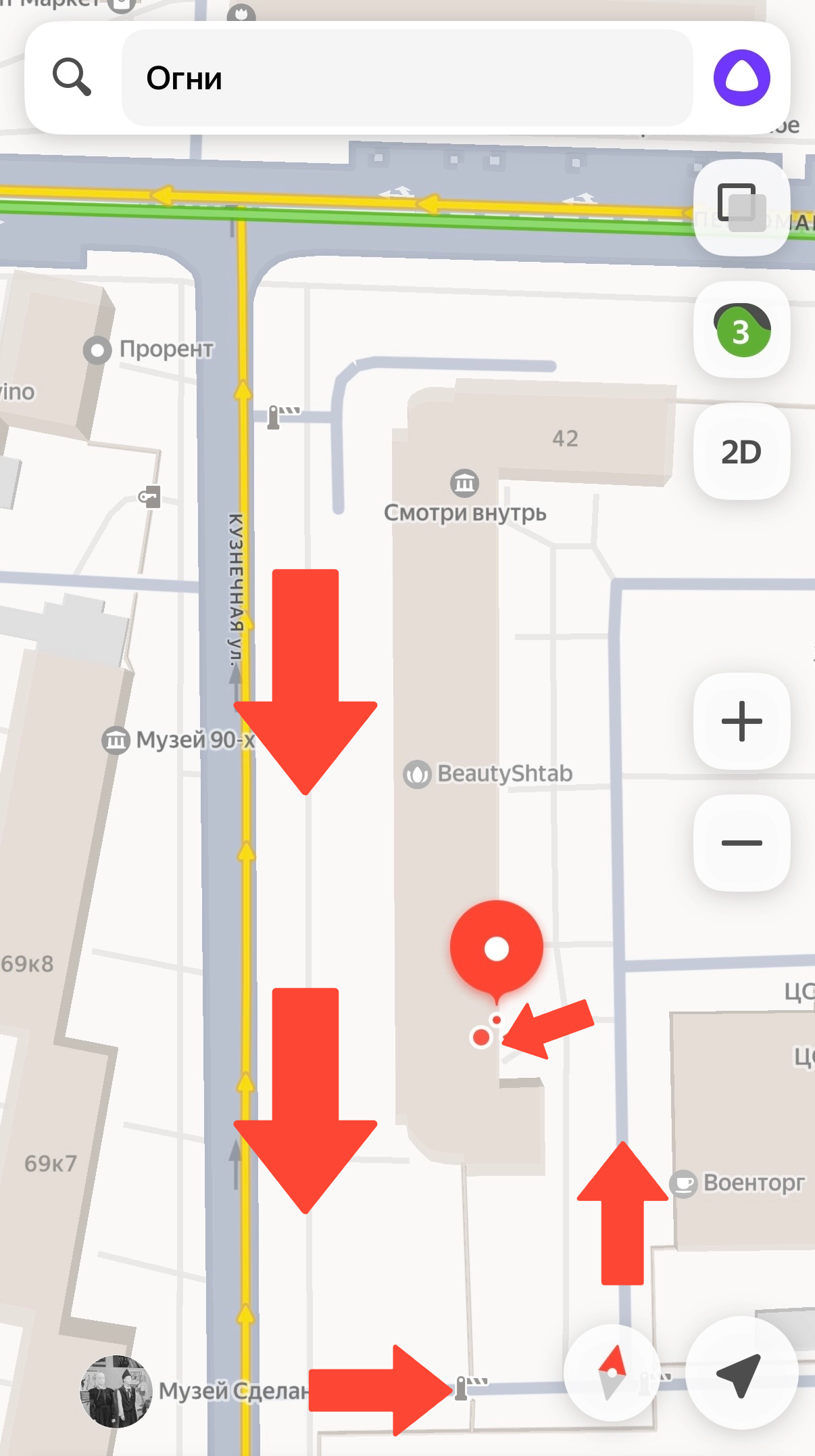 Если вы стоите у входа с плакатом "Аренда офисов" — вам нужно подойти к другой стороне здания. Для этого идите направо по аллее до черных военных ворот. Далее по инструкции выше.